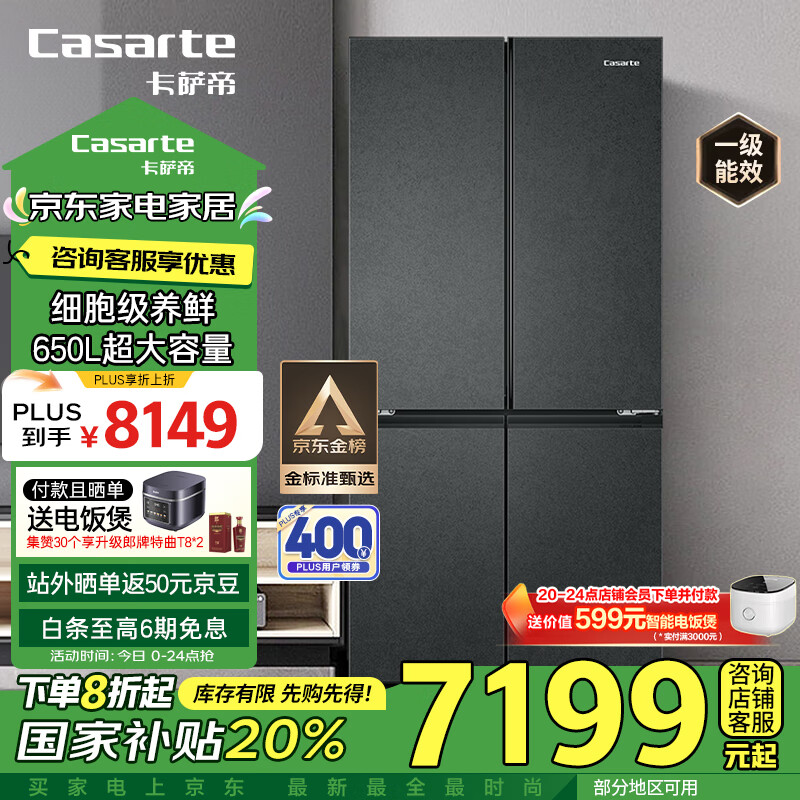 卡萨帝(Casarte)650升原石系列十字四开门一级能效三系统大容量家用【补贴20%】冰箱BCD-650WGCTDM7D9U1价格:8999.00元!