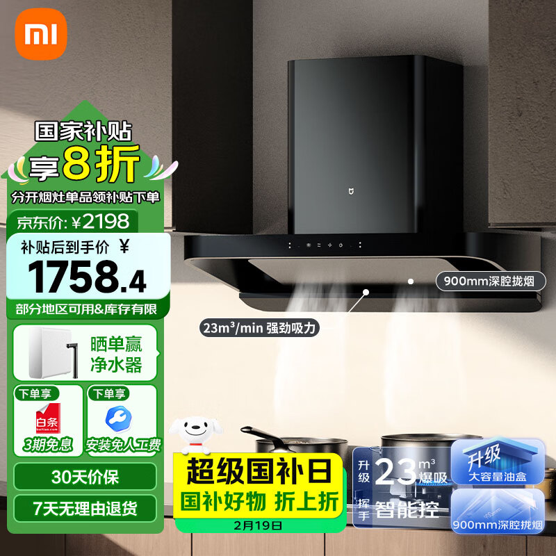 米家小米智能欧式吸油烟机S2 23大吸力顶吸自清洁抽油烟机烟灶联动套装补贴以旧换新4.8kw液化气价格:2198.00元!