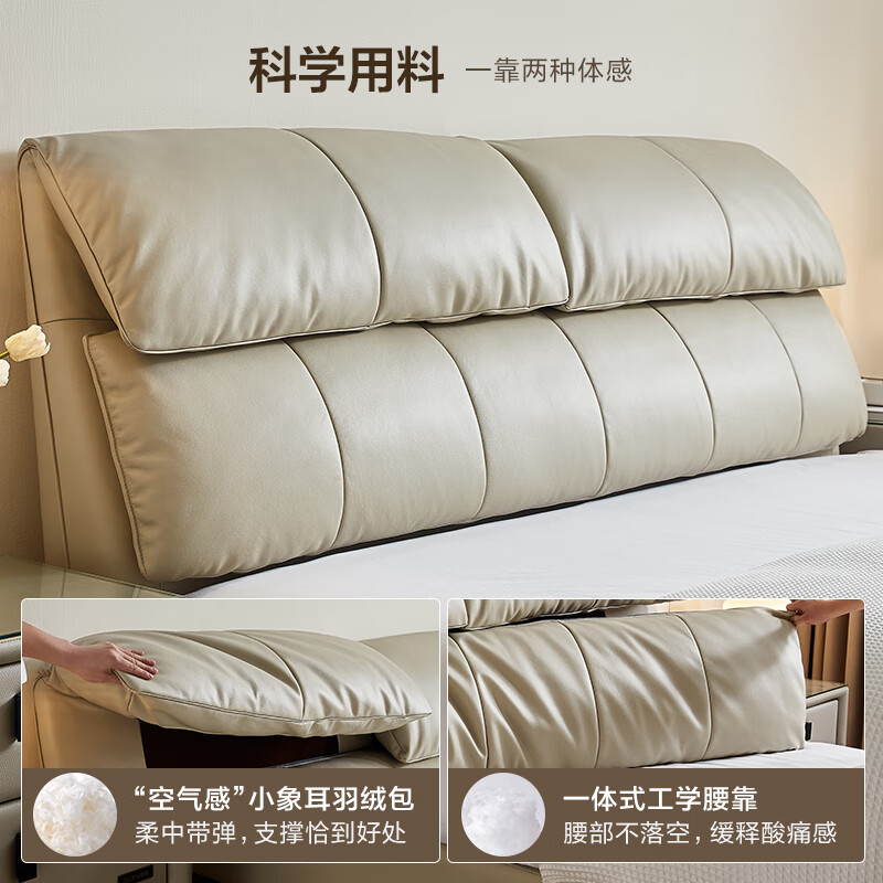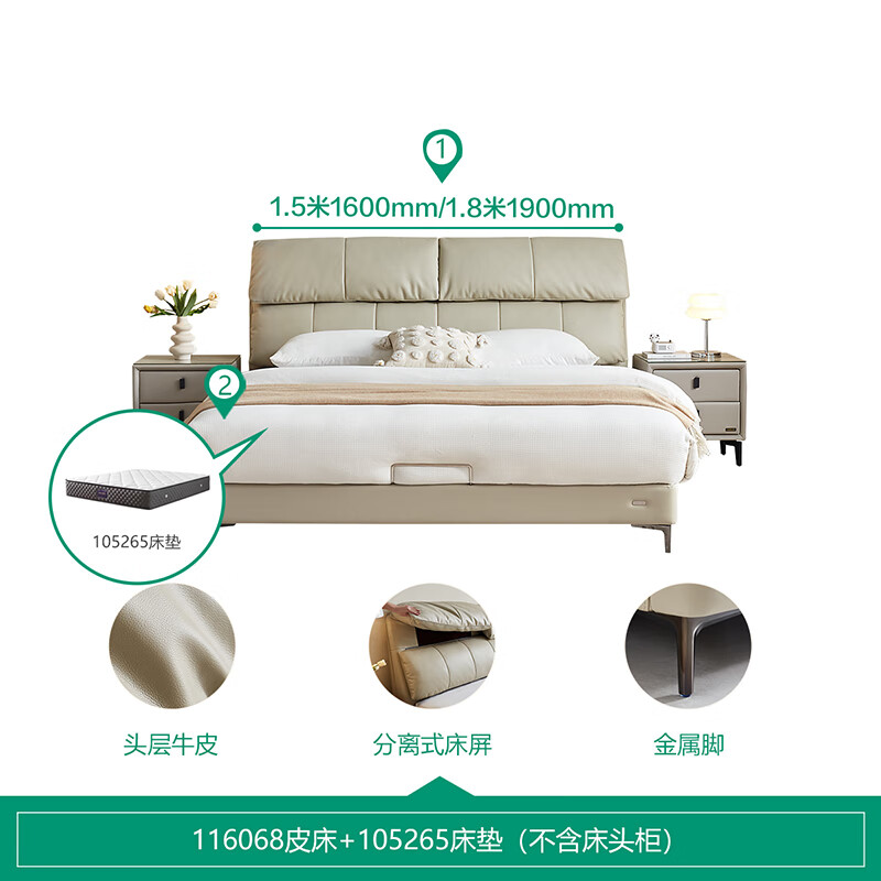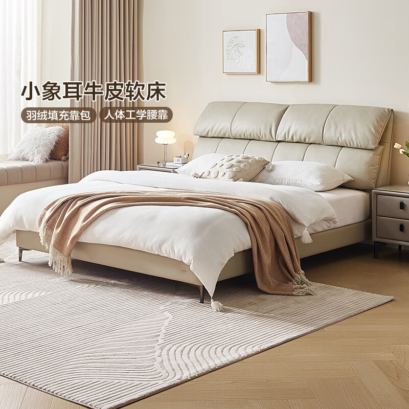 全友家居 真皮床1.5米现代简约大象耳朵头层牛皮卧室双人软包床116068价格:4284.29元!