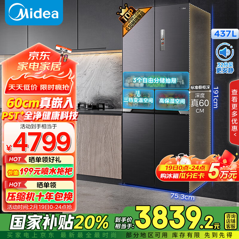 美的(Midea)458纯平全嵌十字对开四开门底部散热风冷无霜一级能效家用收纳分储补贴电冰箱MR-458WUSPZE价格:4799.00元!