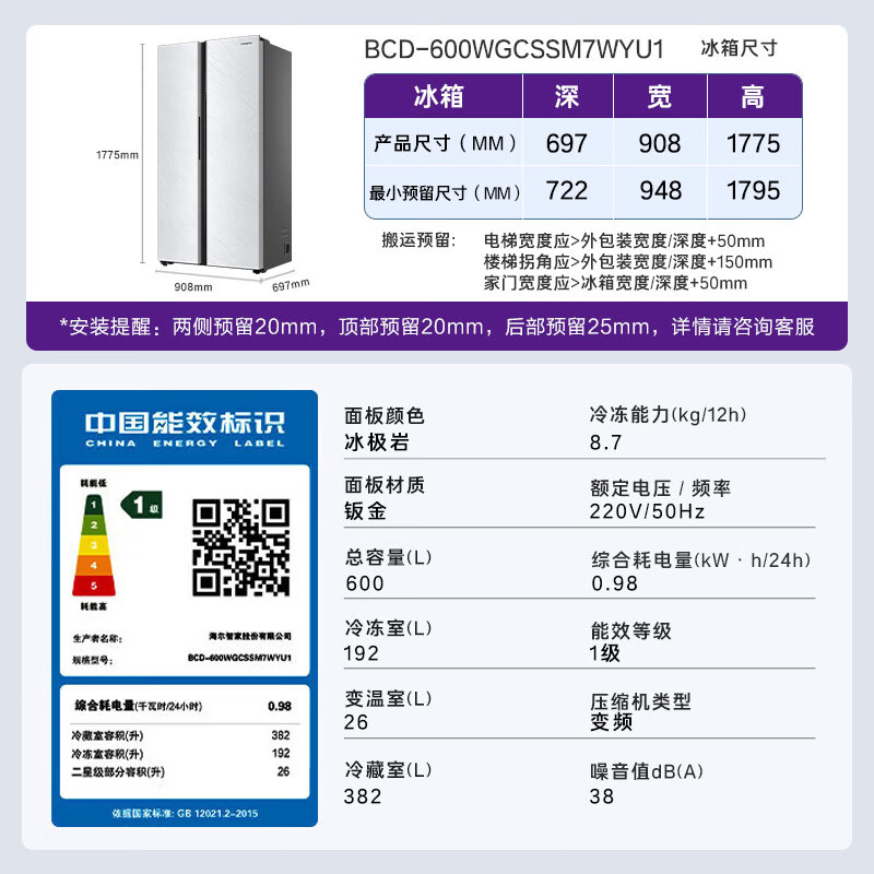 卡萨帝BCD-600WGCSSM7WYU1配置参数: