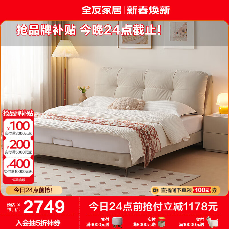全友家居 奶油风泡芙布艺软包床1.5x2米现代简约主卧室双人大床115062价格:3927.14元!