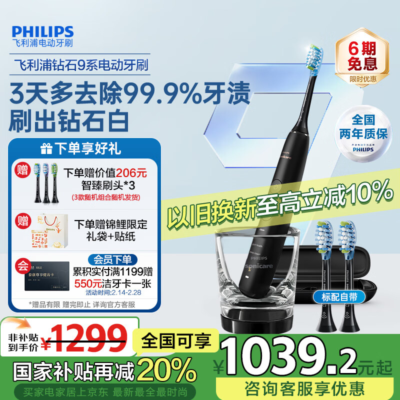 飞利浦(PHILIPS)电动牙刷 钻石9系Pro 成人情侣男女友 生日礼物 充电玻璃杯充电旅行盒黑科技黑色HX9912 补贴价格:1299.00元!