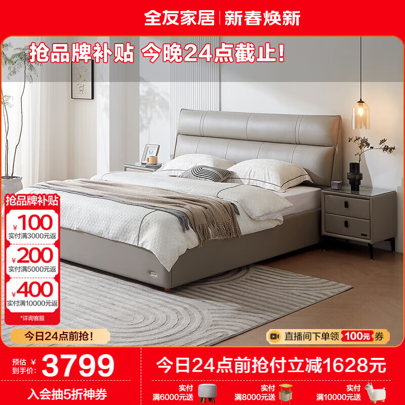 全友家居 头层牛皮真皮床现代简约卧室软包1.8米x2米高箱储物床116033价格:5427.14元!