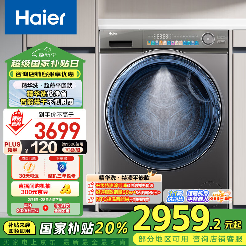 海尔(Haier)滚筒洗衣机全自动 洗烘一体机带烘干10公斤 EG100HPLUSSL6U1 家电补贴 以旧换新 超薄价格:3699.00元!