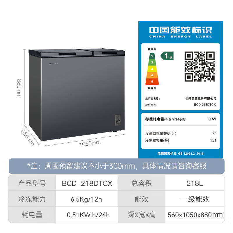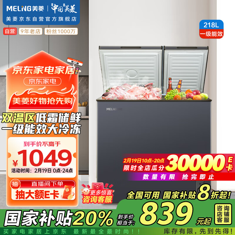 美菱(MeiLing)218升大容量家用冰柜 双箱双温冷柜 顶开门一级能效节能 冷藏冷冻卧式冰箱BCD-218DTCX补贴价格:1049.00元!