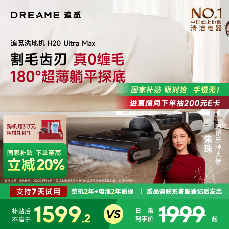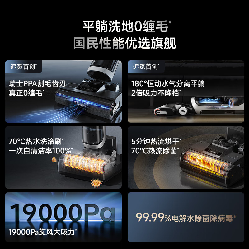 追觅洗地机H20 Ultra 旋锋 Max 0缠毛超薄180°躺平无线吸拖洗烘一体扫地机【Turbo 升级款】价格:1999.00元!