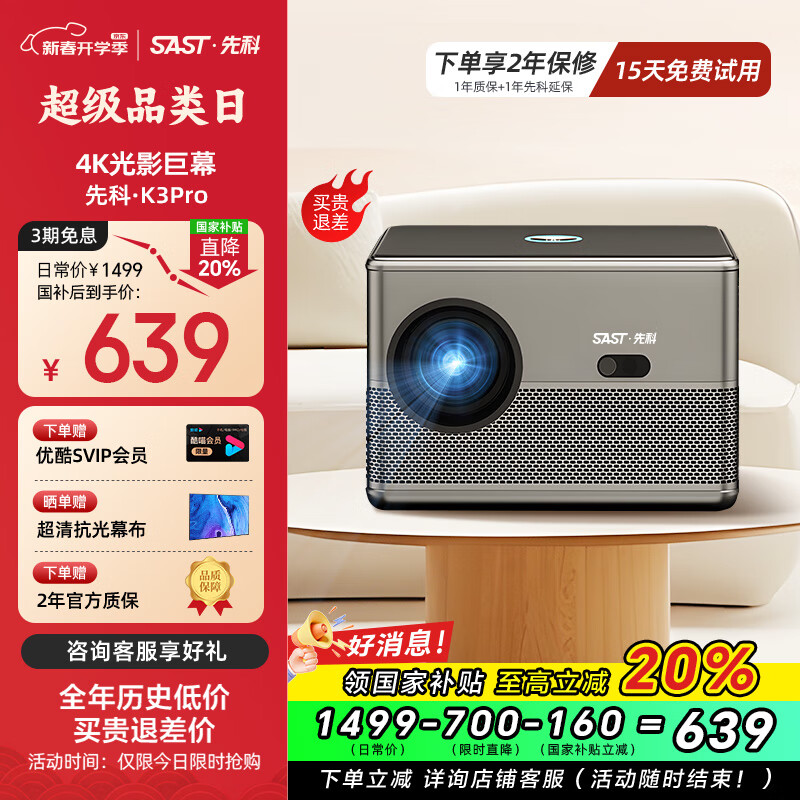 先科(SAST)K3Pro投影仪家用音乐投影机智能家庭影院超清电视(全封闭光机 自动对焦 自动梯形矫正)价格:799.00元!