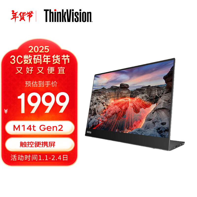 联想ThinkVision14英寸 触控 IPS 低蓝光 2.2K超清分辨率便携显示器M14tGen2价格:1999.00元!