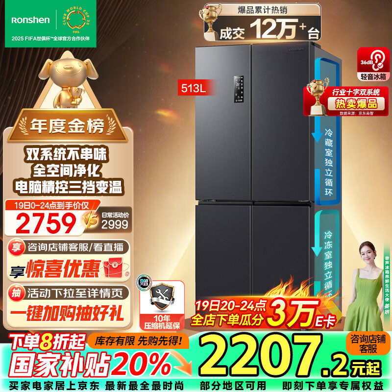 容声(Ronshen)[501升级款]513升十字对开四开门电冰箱家用一级节能效变频双循环风冷无霜BCD-513WD12FPA补贴价格:3058.99元!