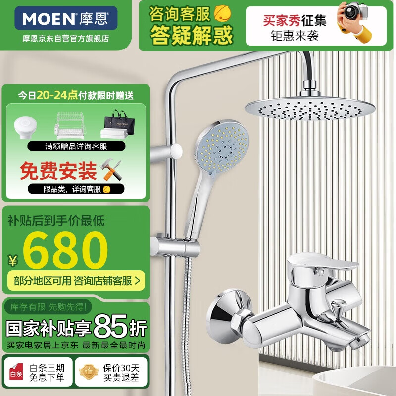 4、家里好几年前买的摩恩淋浴套装锈蚀了,趁活动重新买了一套,和以前一样便于安装,不过顶喷大了薄了不少,挺好的。师傅很认真的安装。送货也很快。