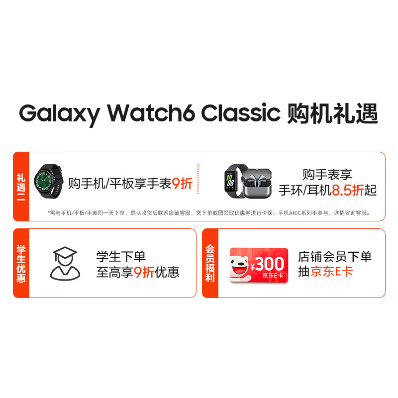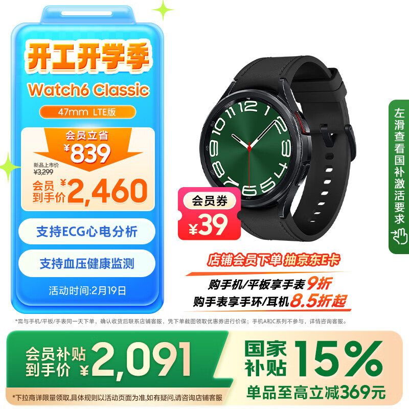 三星 Samsung【政府补贴】Watch6 Classic eSIM智能手表/运动手表/电话手表 47mm 宇夜黑 男女表价格:2499.00元!