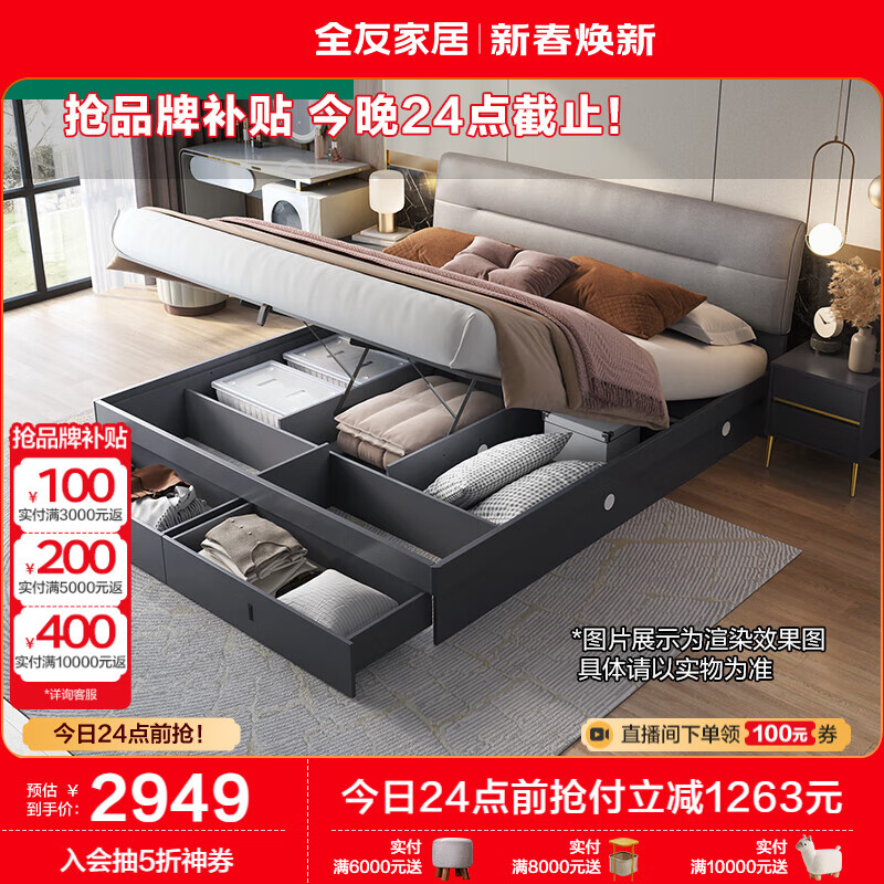 全友家居 主卧室轻奢板式落地高箱储物软包床1.8x2米双人床家具126805价格:4212.86元!