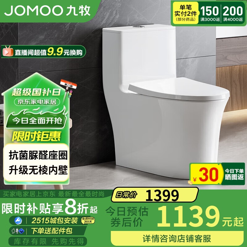 九牧(JOMOO)11368-2-2/41KB-2马桶家用大冲力暴风虹吸节水抗菌坐便器400坑距价格:1199.00元!