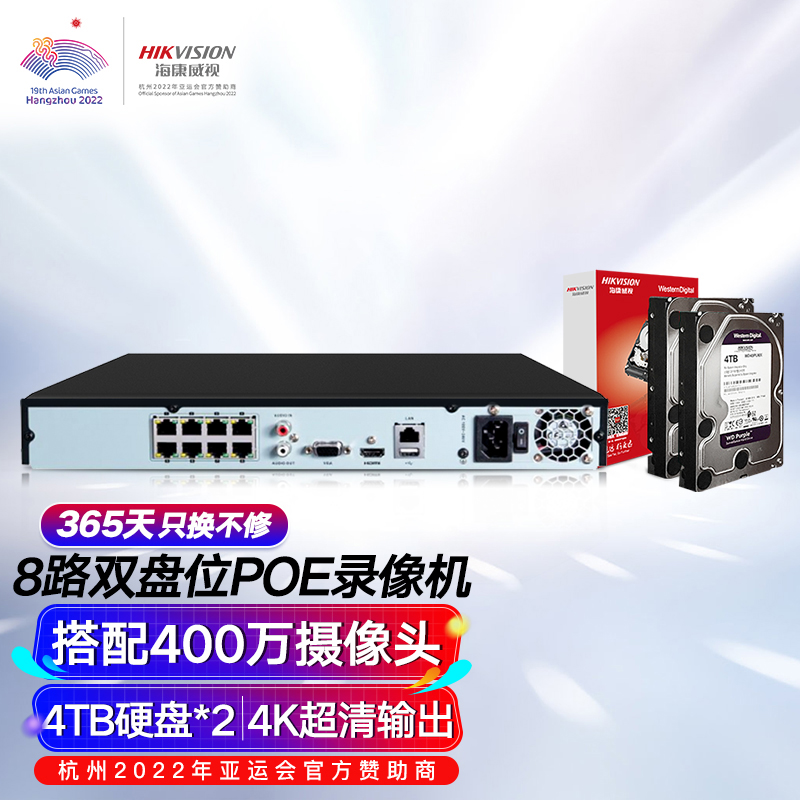 HIKVISION海康威视网络硬盘录像机监控8路NVR满配8个摄像头带4T硬盘DS-7808N-Q2/8P价格:2555.00元!