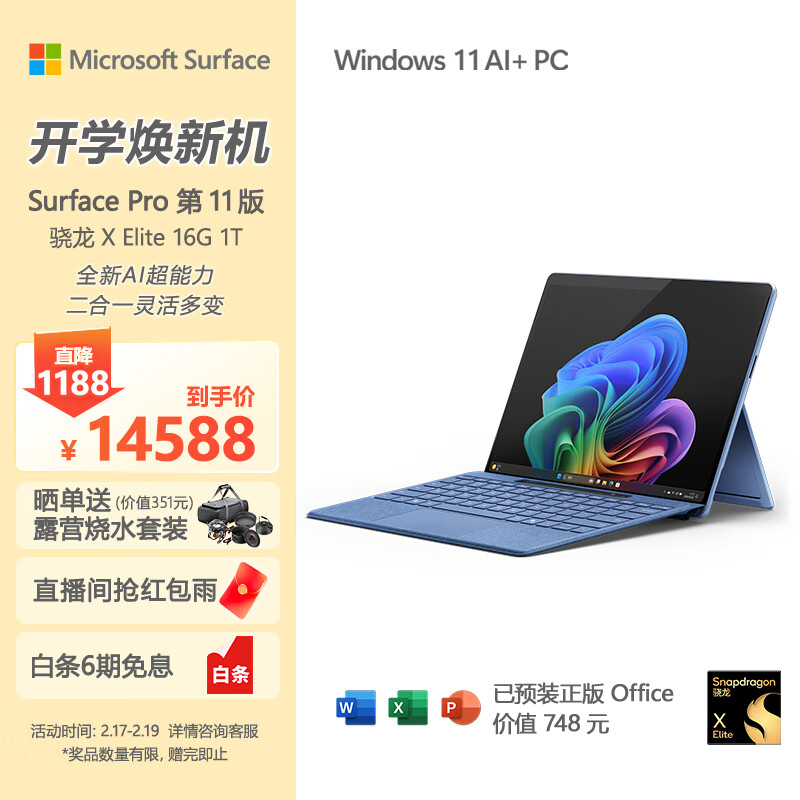 微软(Microsoft)Surface Pro第11版 骁龙X Elite 16G 1T宝石蓝键盘盖触控笔套装二合一平板笔记本电脑 AIPC Pro11价格:14588.00元!