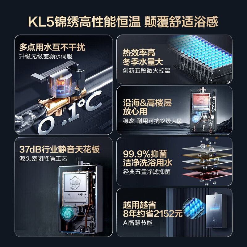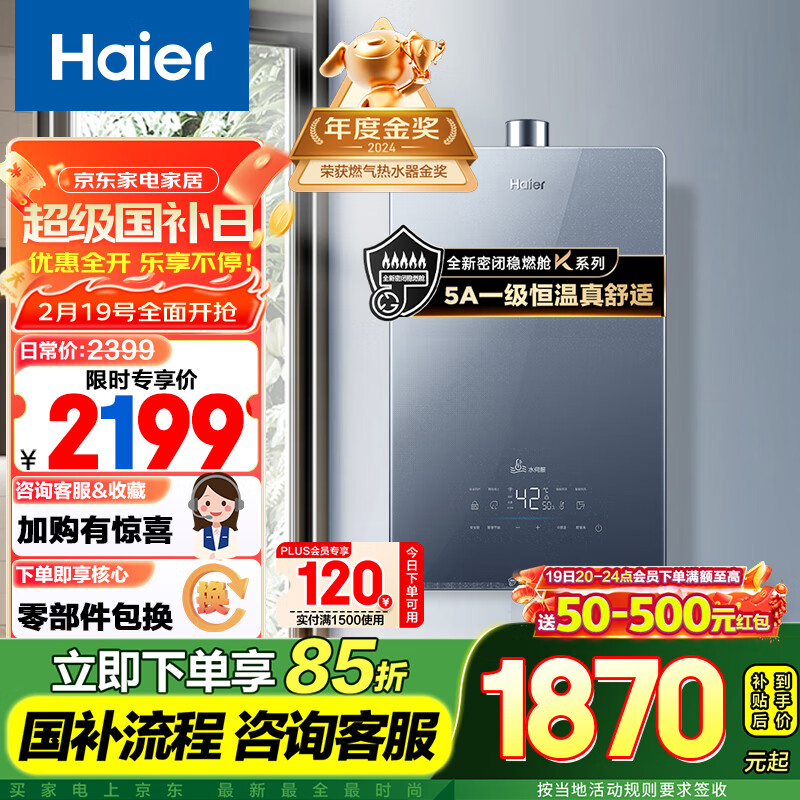海尔(Haier)16升【国补换新立减15%】【KL5】燃气热水器天然气 无级变频水伺服五段微火静音JSQ31-16KL5锦绣U1价格:2399.00元!