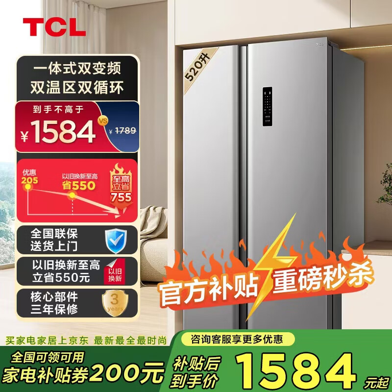 TCL 520升大容量对开门双开门冰箱精细分区一体式双变频双循环风冷无霜超薄机身家用电冰箱以旧换新 双开门冰箱 R520V1-S价格:1784.00元!