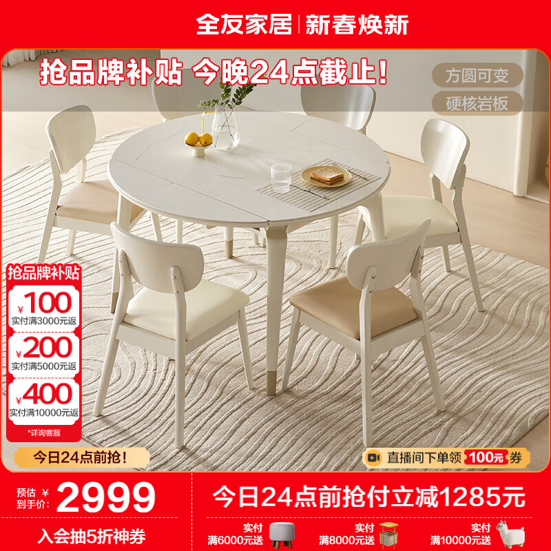 全友家居 现代简约可伸缩多功能岩板方圆餐桌椅子组合家用饭桌DW1121价格:4284.29元!