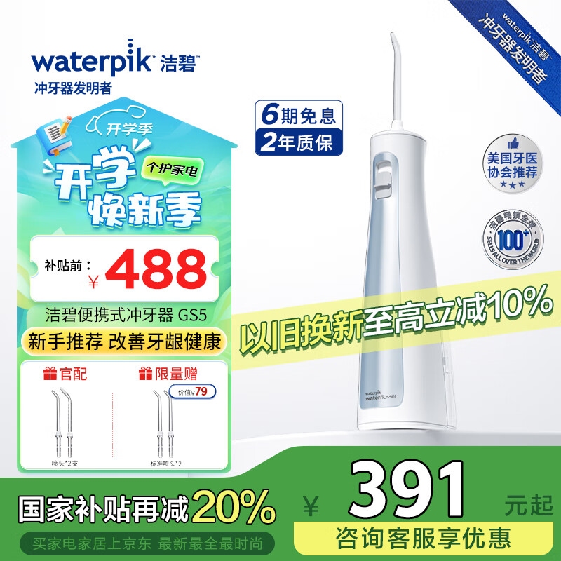 洁碧(Waterpik)冲牙器 便携式电动洗牙器水牙线洁牙器家用立式预防牙结石全身水洗GS5蓝三八节女神礼物价格:488.00元!