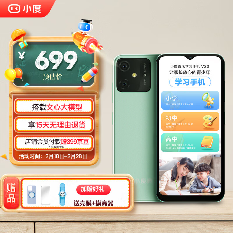 小度青禾学习手机V20 家长可控 AI老师 文心大模型 定制系统 小初高同步课 防沉迷 学生手机 朝气蓝壳价格:699.00元!