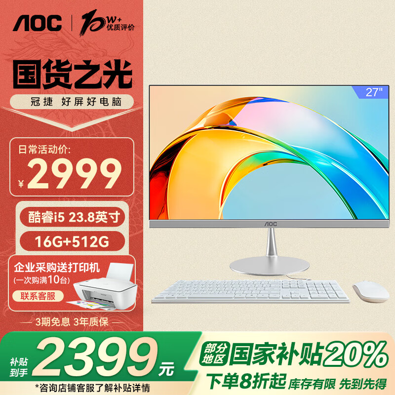 AOC补贴20%美人鱼734Pro 23.8英寸高清办公学习台式一体机电脑(12代i5-12450H 16G 512G WiFi)白价格:2999.00元!