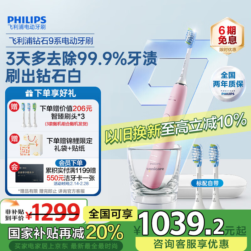 飞利浦(PHILIPS)电动牙刷 钻石9系Pro 情侣款送男女友 生日礼物 充电玻璃杯充电旅行盒黑科技粉色HX9912 补贴价格:1299.00元!