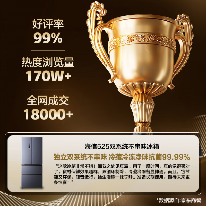 3、非常满意的一次购物体验!外观大气漂亮上档次。海信510,智能变频,双循环,干湿精准控制,抗菌变温锁鲜,大容量,,满足了我的购物需求,冷冻室满足了海鲜,肉类,食品单独存放的需求因为还没有使用,使用后继续追评