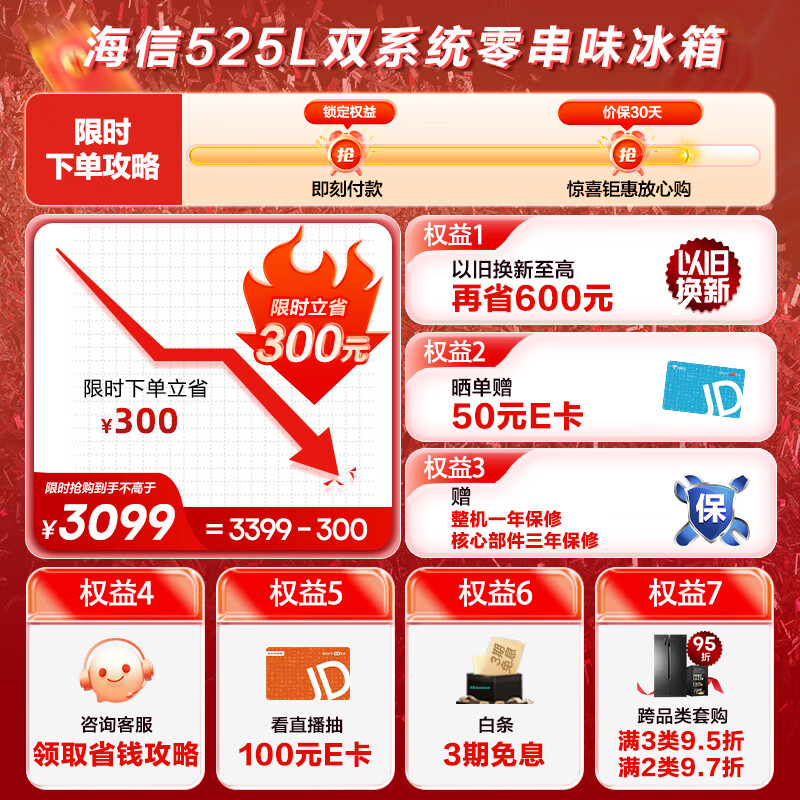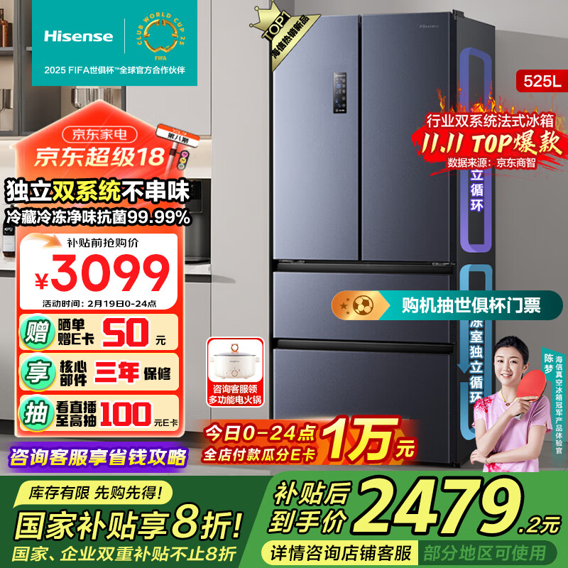海信(Hisense)525升双系统冰箱四开门法式冰箱家用一级能效无霜家电补贴20%以旧换新BCD-525WNK1PU双循环价格:3399.00元!