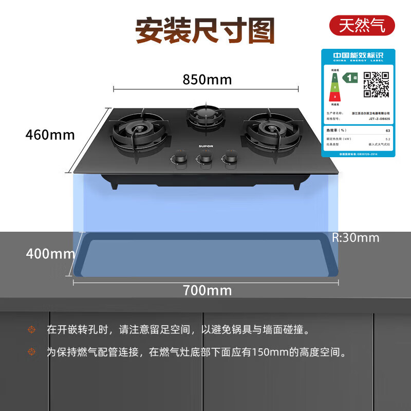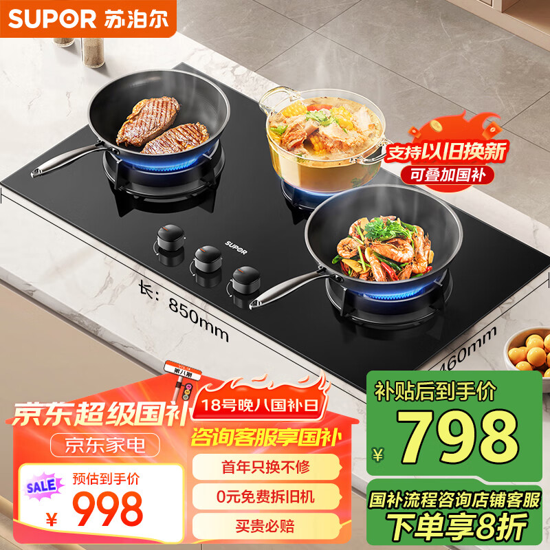 苏泊尔(SUPOR)[家电补贴至高20%]燃气灶煤气灶灶具 三眼5.2KW猛火63%热效率 三区烹饪黑晶面板 天然气DB82S价格:998.00元!