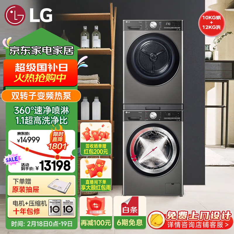 LG小旋风MAX洗烘套装 12kg滚筒洗衣机+10kg双变频烘干机 FCW12Y4PA+RH10V9PV2WR银 补贴以旧换新价格:13198.00元!