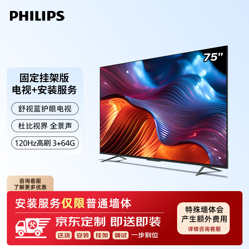 飞利浦(PHILIPS)8099系列75英寸【包安装版-固定挂架送装一体】4K护眼屏 智能液晶平板电视机 75PUF8099/T3价格:3698.00元!