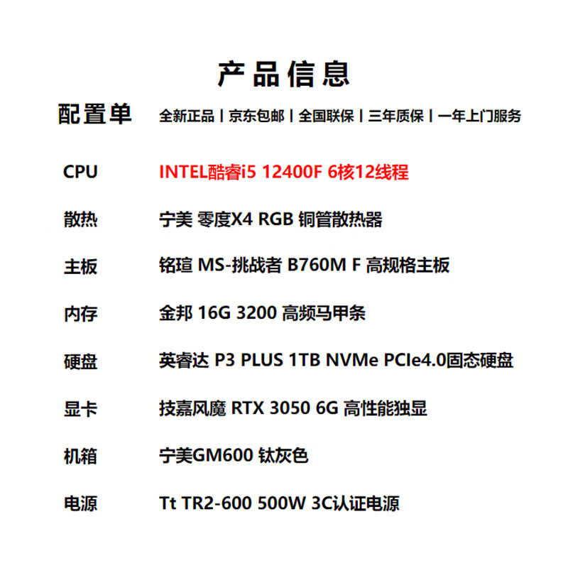 宁美国度魂 i5 12400F/RTX3050/16G内存/1T固态/永劫无间游戏主机/DIY组装电脑/台式电脑主机价格:3799.00元!