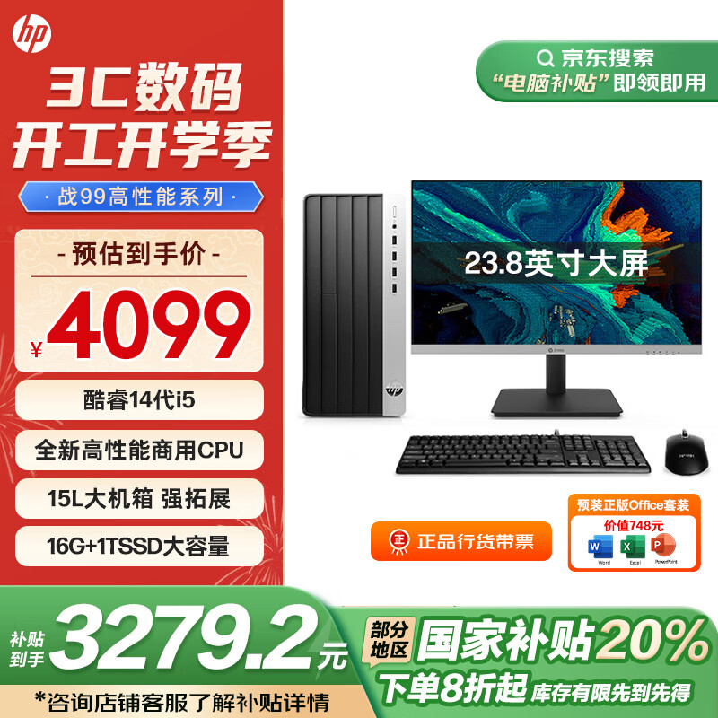 惠普 补贴 战99 高性能台式电脑 (14代i5-14500 16G 1T ) 23.8护眼大屏 14核办公学习 生产力价格:4099.00元!