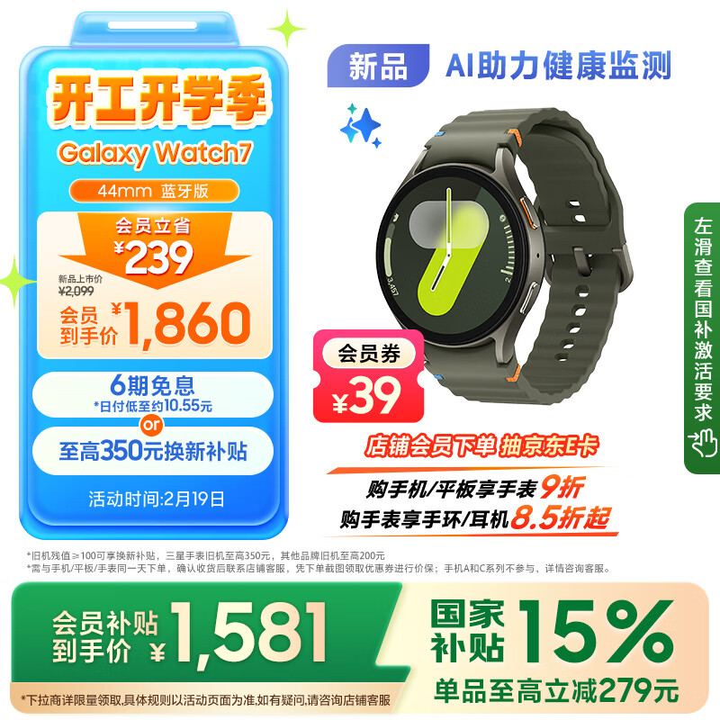 三星 Samsung【政府补贴】Watch7 智能手表/蓝牙通话/运动手表/电话手表 44mm 云岭绿 男女表价格:1899.00元!