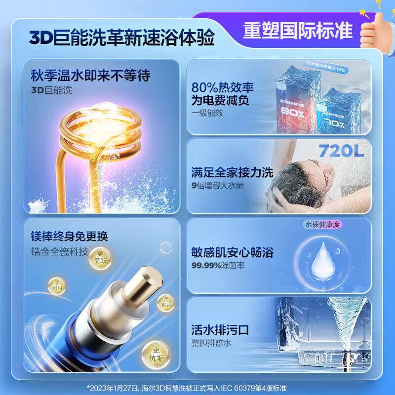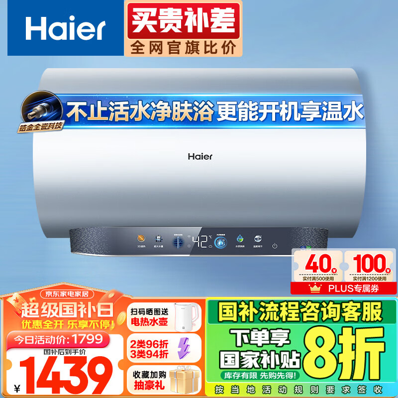 海尔(Haier)60升3D巨能洗鲜活水电热水器家用储水式3300W速热一级能效免换镁棒EC6005-JN3U1补贴以旧换新价格:1799.00元!
