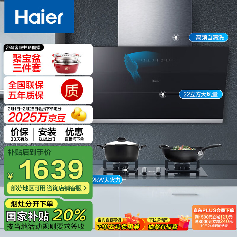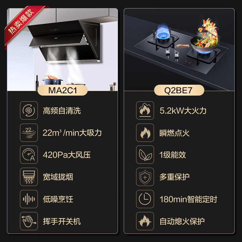海尔(Haier)抽油烟机燃气灶套装 侧吸式22m3/min大吸力 挥手智控 5.2kw定时灶 油烟机灶具套装MA2C1+Q2BE7天价格:2049.00元!