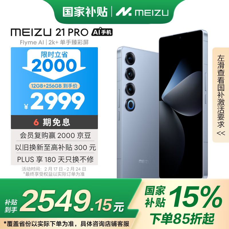 魅族(MEIZU)21 PRO AI旗舰手机 12GB+256GB 冰川蓝 2k+臻彩屏 5000万超稳AI影像 第三代骁龙8 政府补贴价格:3099.00元!