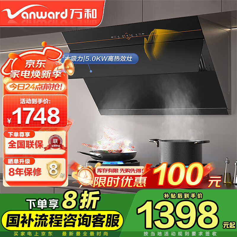 万和(Vanward)侧吸式家用抽油烟机 燃气灶具烟灶套装 23风量挥手智控 自动清洗 烟灶套餐DJ738+G6L50(天然气)价格:1848.00元!