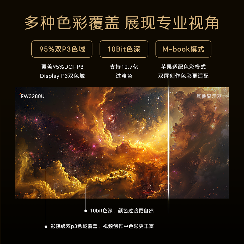 这款明基EW3280U还不错的,这个屏幕真的太好了,我终于是拥有了自己的书桌,立马安排上了显示屏这个屏幕特别大,而且功能模式也特别多,可以护眼可以看电子书嗯看电影看剧看文件都特别的方便,太棒了??而且和家里老公的LG屏幕相比较感觉清晰度更高呢