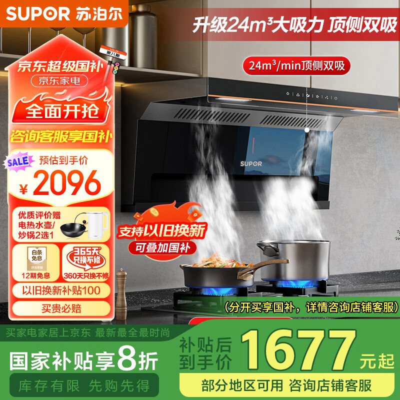 苏泊尔(SUPOR)抽油烟机家用 24立方大风量430Pa风压 顶侧双吸7字型挥手智控自清洁 燃气灶套装DE15+DB28天然气价格:2096.00元!