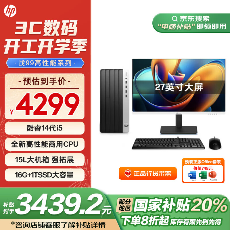 惠普 补贴 战99 高性能台式电脑主机 (14代i5-14500 16G 1TSSD) 27英寸大屏 办公学习机 生产力价格:4299.00元!
