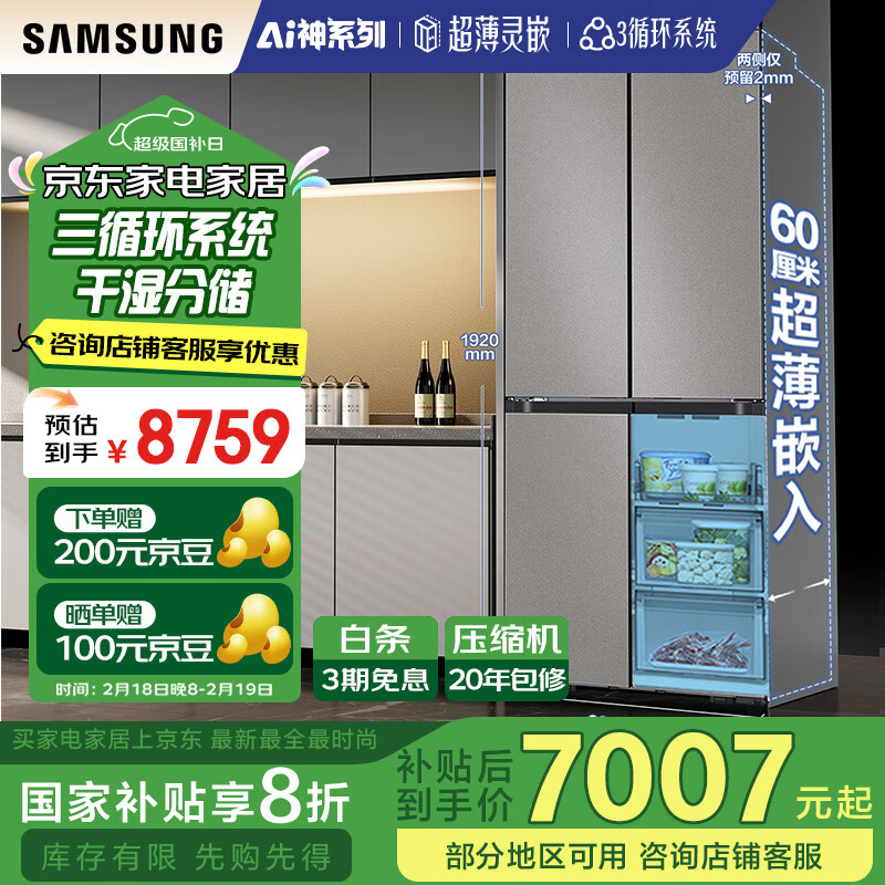 三星(SAMSUNG)AI神冰箱8系进阶款 501L四开门十字门三循环超薄零嵌干湿分储以旧换新补贴 灰 RF50DG5131QQSC价格:8999.00元!