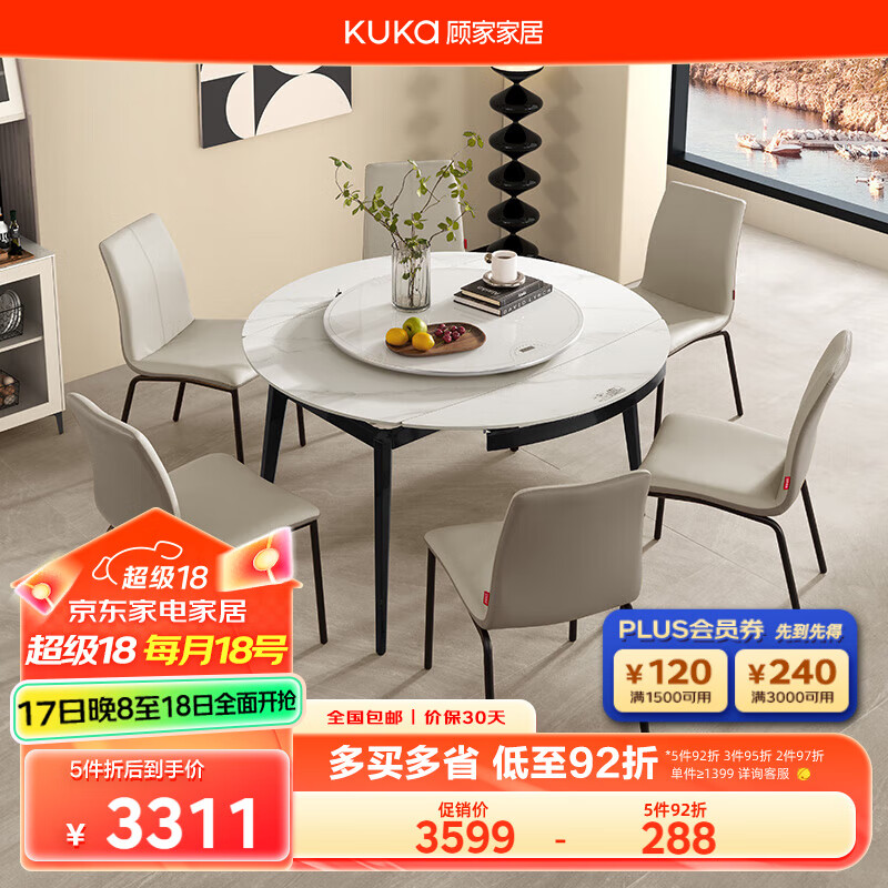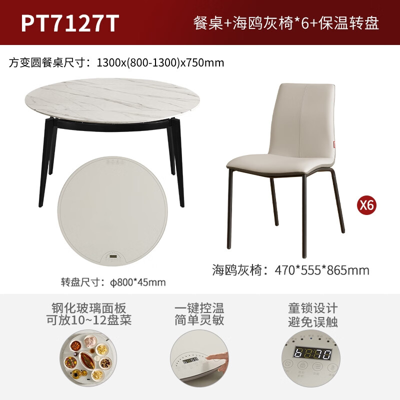 顾家家居(KUKA)拉伸岩板餐桌椅家用饭桌可伸缩圆桌PT7127T 餐桌+海鸥灰椅*6+转盘价格:3599.00元!