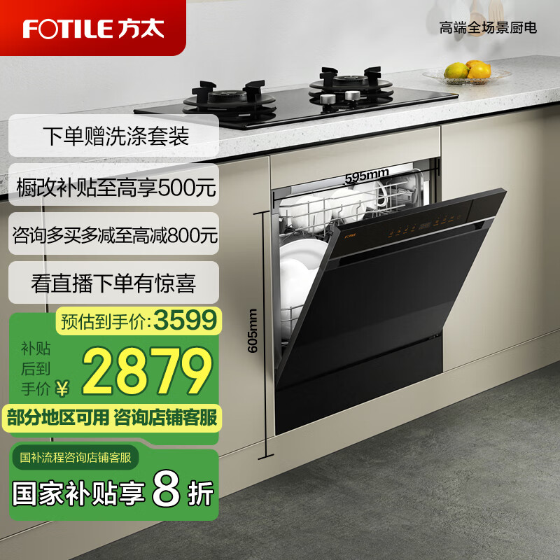 方太(FOTILE)洗碗机嵌入式家用 高能气泡洗 12套大容量 灶下洗碗机 一级水效 30min超快洗 NJ03S价格:3599.00元!