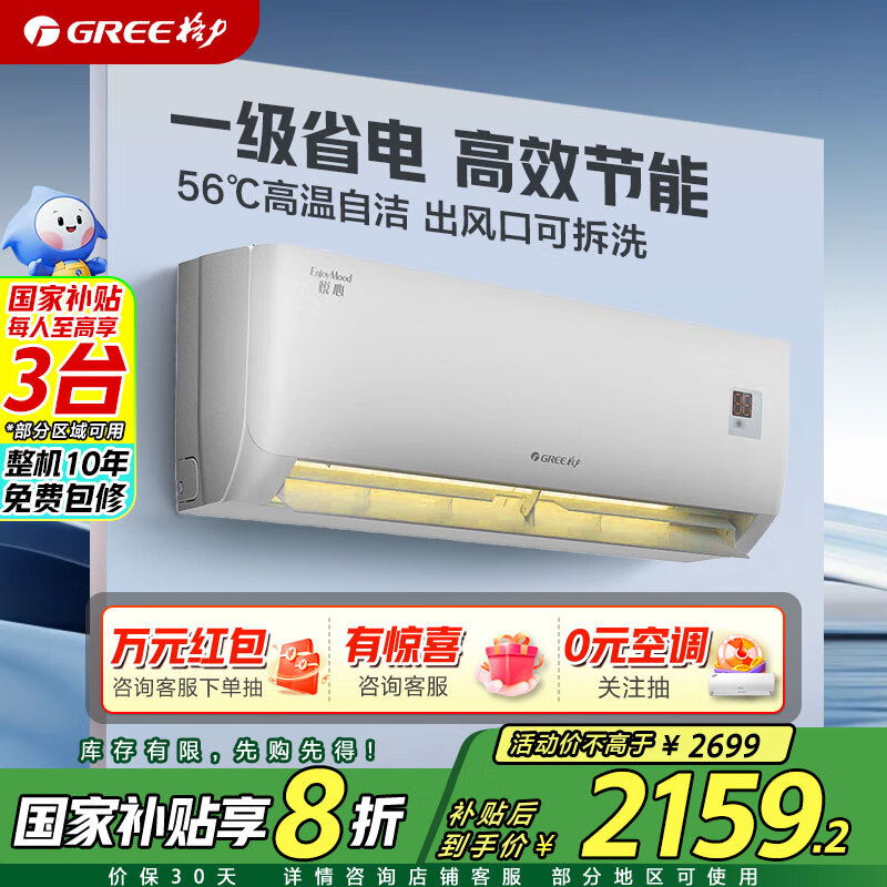 格力(GREE)1.5匹悦心新1级能效适用面积约14~18㎡变频卧室空调挂机KFR-32GW/NhGh1B 2025补贴20%空调价格:2699.00元!