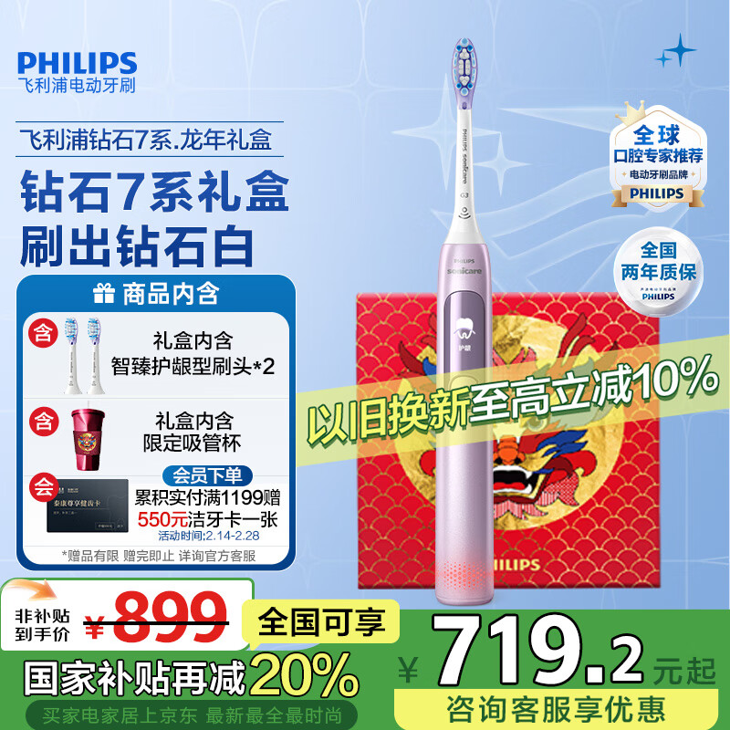 飞利浦(PHILIPS)电动牙刷成人 情侣款送男/女友生日礼物 5种模式2支护龈刷头钻石7系樱花粉 限定礼盒 补贴价格:899.00元!