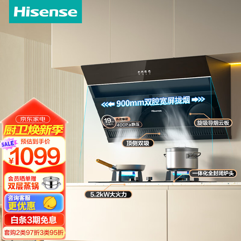 海信(Hisense)抽油烟机 家用大吸力19立方侧吸式吸油烟机小户型老式厨房换新5.2KW大火力烟灶套装905A+DB31价格:1199.00元!