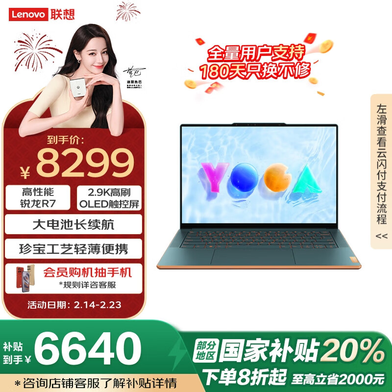 联想笔记本电脑YOGA Air14s轻盈本 14.5英寸轻薄本R7 32G 1T 2.9K OLED高刷日光映潮【补贴20%】价格:8299.00元!