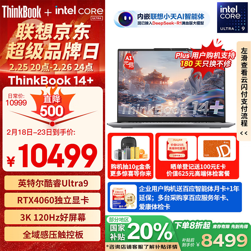 ThinkPad【补贴20%】联想笔记本电脑ThinkBook 14+ AI全能本 英特尔酷睿Ultra9 32G 1T 3K RTX4060价格:10499.00元!